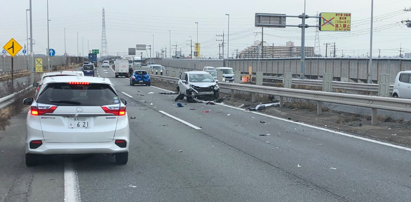 加古川バイパス上り加古川西で3台玉突き事故やりたて 破片がめちゃくちゃ散乱してる