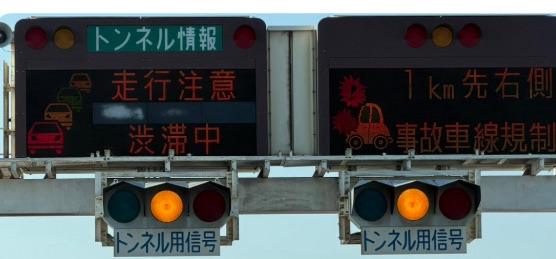 電光掲示板に事故通行止めの表示出始めた
