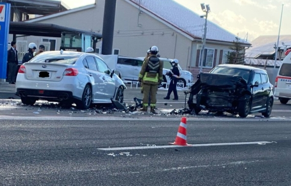 車両2台の正面衝突事故処理中。どうやったらそうなるんだよ